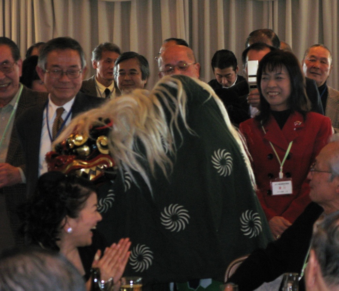 会話と食事とお酒を十分に堪能したころに、昔懐かしい獅子舞の登場です。会員の張替さんの紹介で山本様が演じてくださいました。