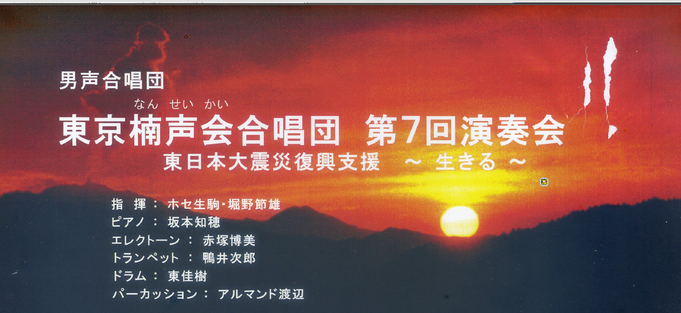 生駒芳正(ホセ生駒)さんが指揮をされている男声合唱団 東京楠声会合唱団の 第7回演奏会が10月14日(月・祝日)開催されます。 会員の鴨井次郎さんがトランペット、東佳樹さんがドラムで出演されます。 コンサートの詳細は、下の画像を左クリックしていただくとご覧になれます。 チケットは生駒さんまたは事務局までお問い合わせください。