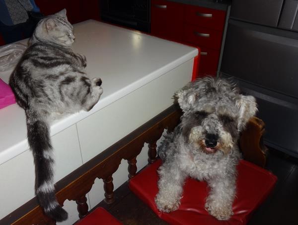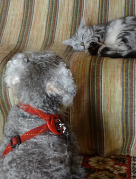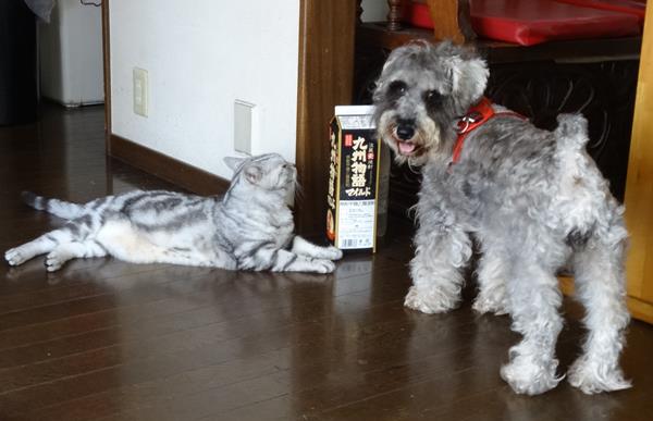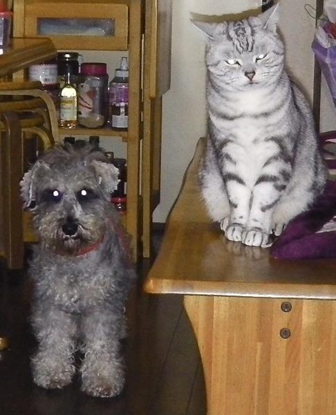 さて、この猫犬の米独コンビ、ジローの方が3年先輩なので威張っています。食事は当然別々ですが、おやつの煮干しはジローが先で、ナナはしばらくジローが食べるのを見ています。