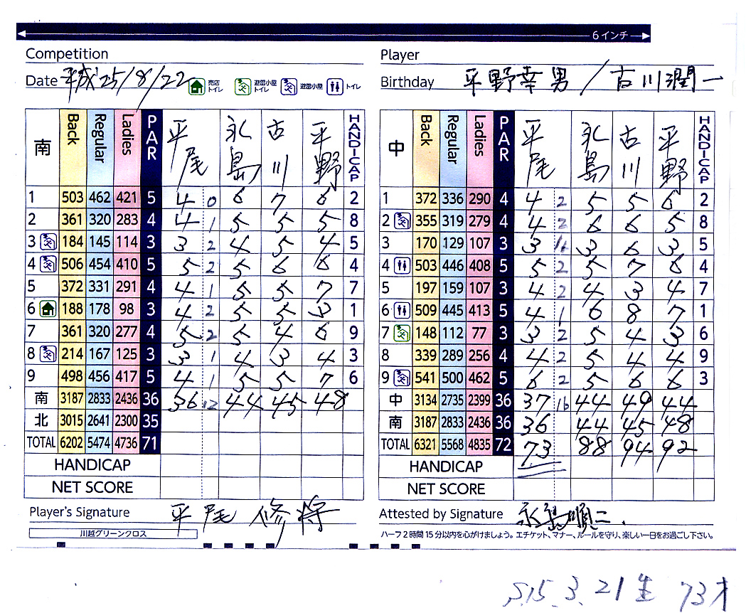 ちなみに 平尾氏は昭和15年3月21日生まれ(73歳) 川越グリーンクロス パー72のところ OUT36 IN37 グロス73 (パット数 28)