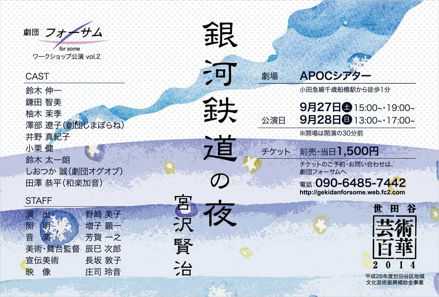 このほど、添付のチラシのように、9月27日(土)28日(日)の2日間、小田急線・千歳船橋駅徒歩1分のAPOCシアターという小さなスペースで、宮沢賢治の「銀河鉄道の夜」のリーディングの会を行います。