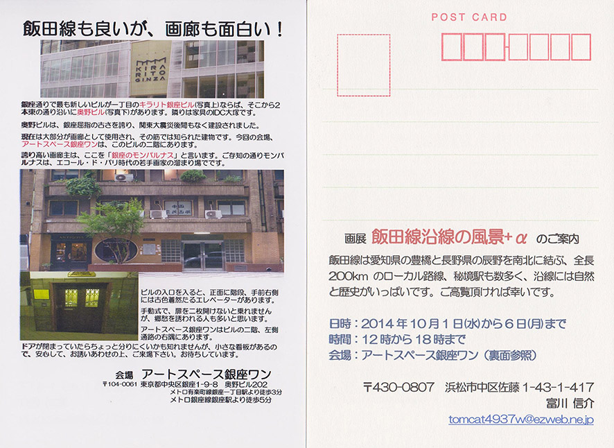 来たる10月1日より6日まで、銀座一丁目の画廊「アートスペース銀座ワン」(クリックすると地図)で絵画展「飯田線沿線の風景+α」を開催します。
