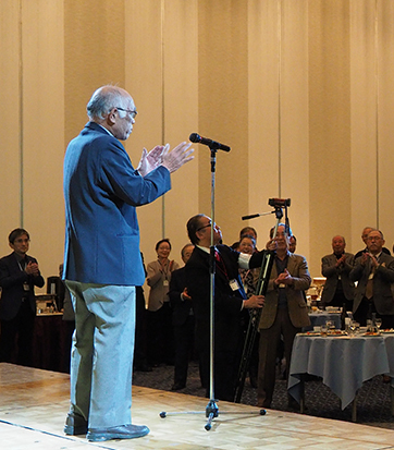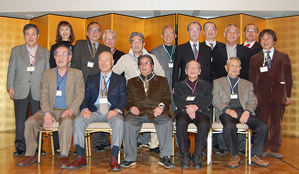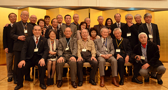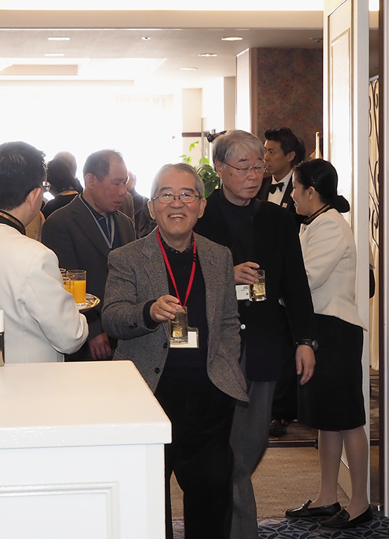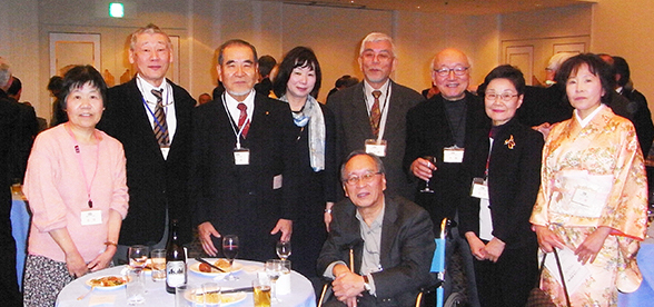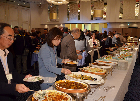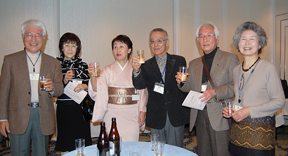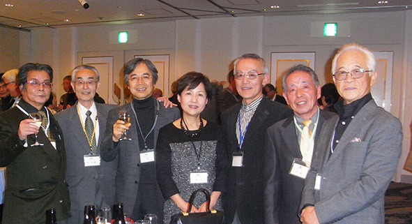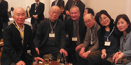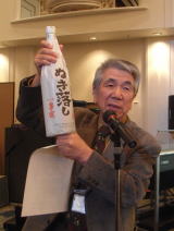 | 乾杯の直後からあちこちで、昔の仲間や、久しぶりに顔を合わせた仲間と、お互いの元気を確かめ合う話の環が急激に広がりました。和洋中の料理とお酒に舌鼓の皆さん。。こだわりの日本酒だけは、OB会の持ち込みです。今年も日本酒の担当は小幡健一さん。今までの豊富な経験から厳選して集められたおいしい日本酒が話の環に花を咲かせます。 |