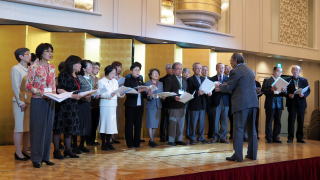 参加者の皆様はまず受け付け、首から名札を下げ、参加者名簿を受け取り、ドリンクを片手に会場に入場します。松本洋二さん指揮のシニアアンサンブル・ウエルカムコンサートの新春にふさわしい選曲で徐々に雰囲気を盛り上げて行きます。