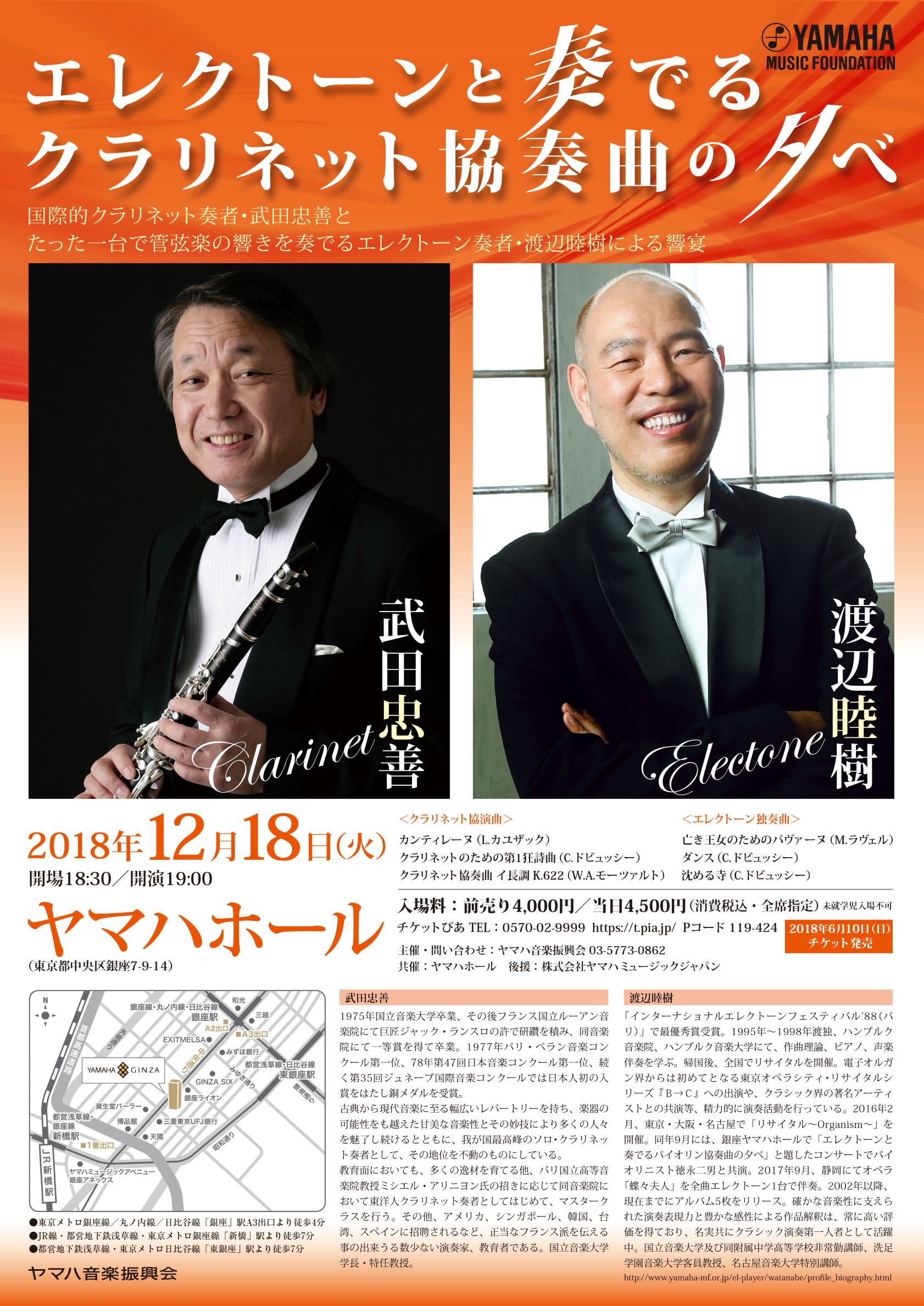 ヤマハ音楽振興会所属エレクトーンプレイヤー渡辺睦樹と国際的クラリネット奏者で国立音楽大学学長も務められる武田忠善氏が銀座ヤマハホールで共演します。