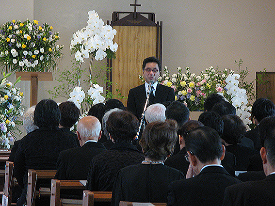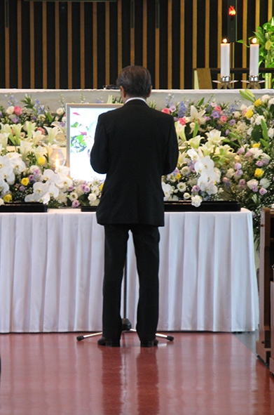 信仰生活での交流の思い出や、生涯のご紹介があり、喪主からお礼のご挨拶の後、参列者の献花がしめやかに行われ最後のお別れをしました。