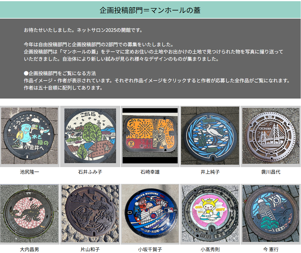 今回の「ネットサロン2025」は自由投稿部門と、テーマを定めた企画投稿部門に分かていて、それぞれ41名、19名からの投稿がありました。企画投稿部門のテーマはマンホールです。