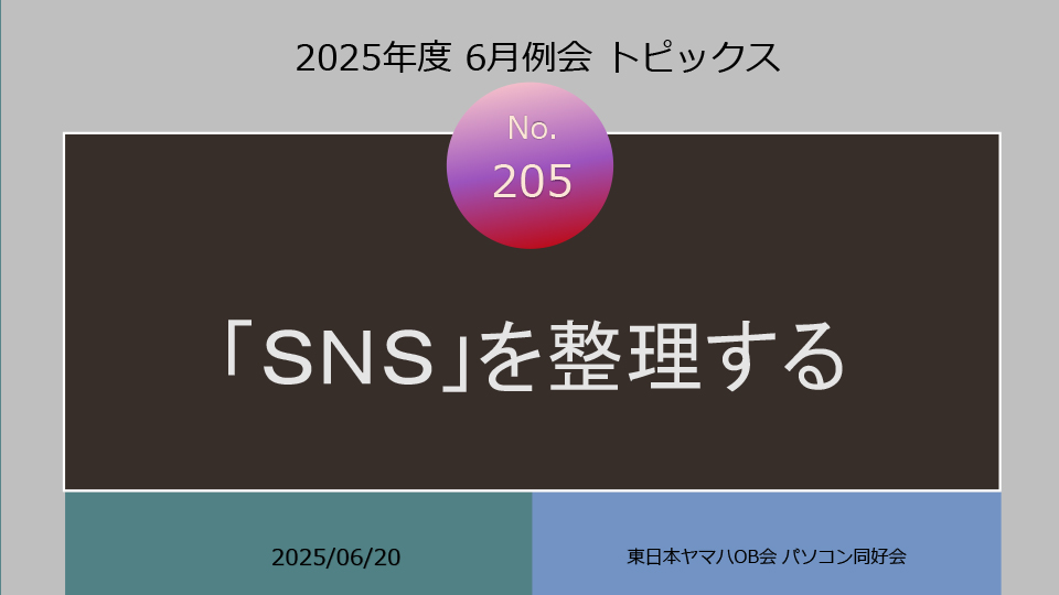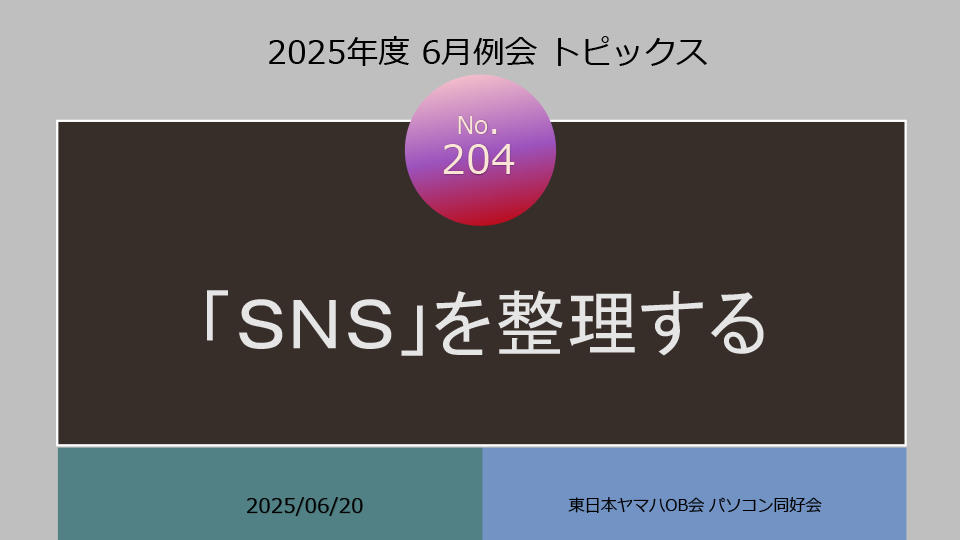 2025年度6月例会開催 ◆日 時:2025年6月20日(金) 13:30~ ◆会 場:新橋ばるーん ◆会 費:1,000円 ◆トピックス ①「SNS」を整理する・・・・・・・・・・田中 達也 ②PowerPointのPDFデータ化・・・・・・ 鴨井 次郎 ③質疑応答 ・・・・・・・・・・・・・・ 三国 龍夫
