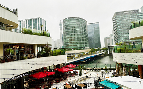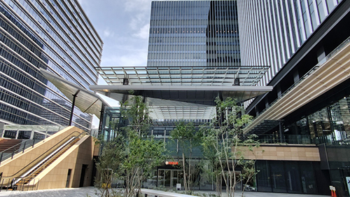 ショップはみなとみらい21中央地区に竣工した「横浜シンフォステージウエストタワー」1~3階にあります。このビルは店舗オフィス、ホテルで構成された複合施設です。ビルの最上部にはYAMAHAのブランドが掲示されています。