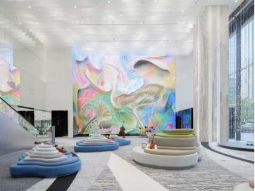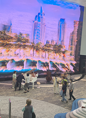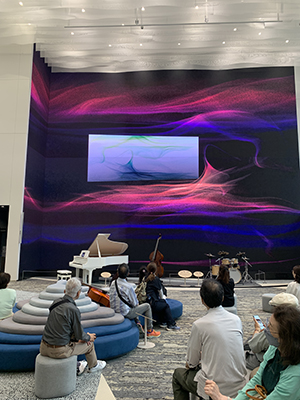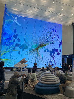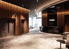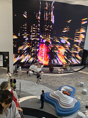 ヤマハの企業イメージを発信する巨大スクリーンが設置された1階のフロアー |