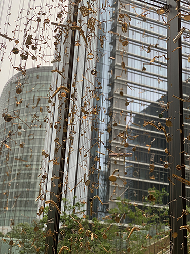 管楽器の部品等を利用したオブジェは指定されたソファーから見ると見事ト音記号が現れる |
