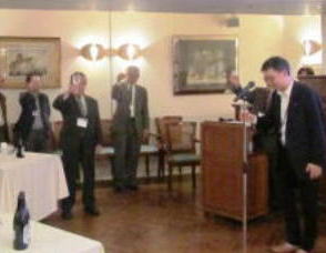 最初の挨拶は、松岡正治さん。執印重役からカタログなどなくても、「商売はできる」と発破を掛けられたとの思い出を語っていただきました。乾杯の発声は、潟gクラス執行役員の久世 健さん。「少し微熱気味の実績は、営業努力で踏み堪える」と元気に宣言。