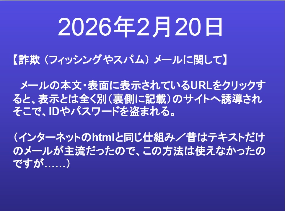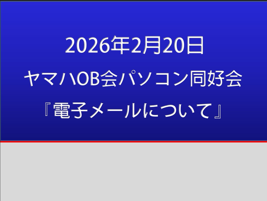 | ◆日 時:2026年2月20日(金) 13:30~ ◆会 場:新橋ばるーん ◆会 費:1,000円 ◆トピックス: はじめに「Junbo-Brass]の紹介・・・鴨井次郎 「電子メールについて」 ・・・・・・・三国龍夫 その他何でも相談・・・・・・・・・・三国龍夫 |